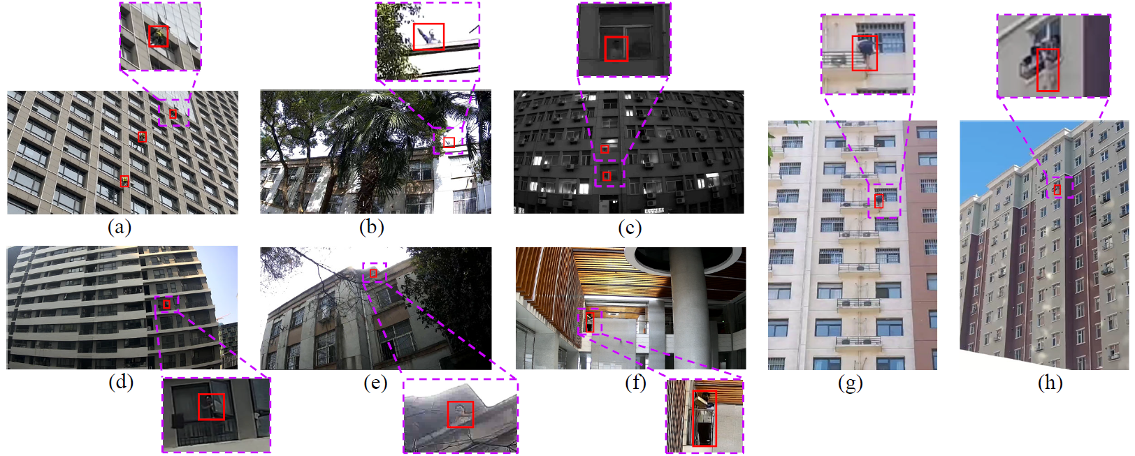 With the increasing number of buildings, incidents of falling from heights have become more and more frequent. Accurately detecting individuals at the edges of buildings through surveillance videos is crucial for issuing early warnings. However, this task is challenging due to varying lighting conditions, heavy occlusions, and small sizes of person instances captured at a long distance. Therefore, there is a high demand to develop methods for Person Detection at the Edges of Buildings (PDEB) through surveillance videos. In this work, we construct a new dataset, named EBPersons, specifically for PDEB. EBPersons consists of 1,314 videos shot from over 300 scenes in various lighting conditions. Moreover, to establish a benchmark, we propose a new approach for the PDEB task, which utilizes scale distributions of training data and temporal context in videos. Extensive experiments are conducted on EBPersons to compare our method with other detectors, including generic object detectors, pedestrian detectors, and video object detectors. The results demonstrate the superior performance of our proposed method, providing an effective baseline for future research on PDEB.